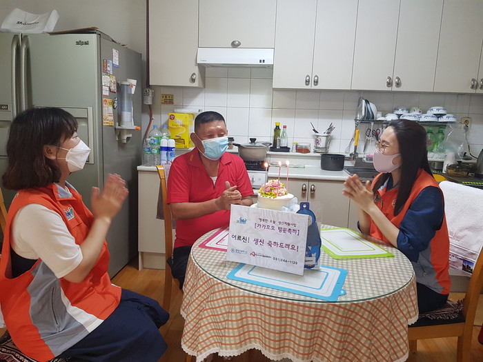 경기 양주시무한돌봄행복센터가 최근 이달 생일을 맞이한 저소득·위기가정 가구를 대상으로 ‘가가호호 생일지원’ 행사를 개최했다. 센터는 이날 행사를 통해 대상자들의 안부 확인과 말벗 서비스, 생신축하 등을 진행했다. 사진은 센터 관계자가 대상자 집을 방문해 생일축하를 하고 있는 모습. (사진제공=양주시청)