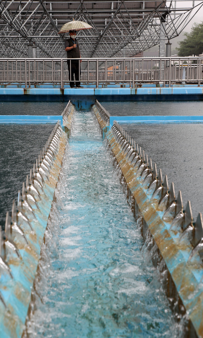 깔따구 유충이 처음 발견된 인천 공촌정수사업소에서 22일 한 관계자가 침전소를 바라보고 있다.