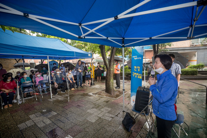 김수영 서울 양천구청장이 신월4동 한빛종합사회복지관 앞에서 ‘찾아가는 현장구청장실’을 열었다. 이번 현장구청장실에서는 포스트코로나 시대의 마을축제 계획과 공공시설 운영에 대한 구정방향을 안내하고, 주민 등의 의견을 듣었다. 사진은 김 구청장(오른쪽)이 복지관 운영 재개에 대해 주민들에게 안내하고 있는 모습. (사진제공=양천구청)