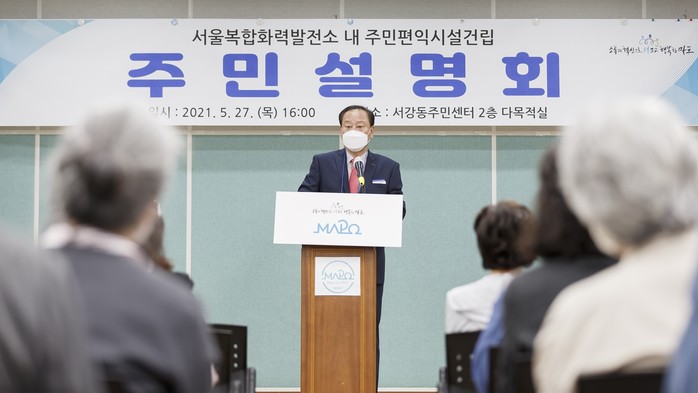 서울 마포구는 27일 서울복합화력발전소내 주민편익시설 건립 주민설명회를 열었다. 이 설명회는 주민편익시설 건립 추진 방안 등을 설명하고 주민의 의견을 수렴하기 위해 마련됐다. 사진은 주민설명회에서 유동균 구청장(가운데)이 인사말을 하는 모습. (사진제공=마포구청)