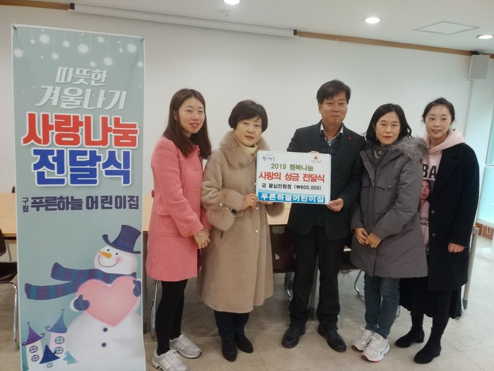 서울 동대문구 장안1동 푸른하늘 어린이집이 지난 23일 장안1동 주민센터에 방문해 이웃돕기 성금 80만원을 기탁했다. 사진은 성금 기탁 후 기념촬영을 하고 있는 관계자들의 모습. (사진제공=동대문구청)