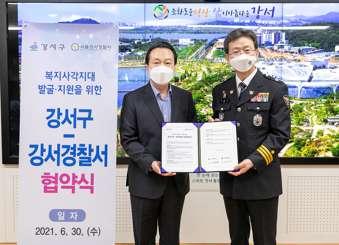 서울 강서구가 30일 강서경찰서와 ‘복지사각지대 발굴·지원을 위한 업무협약(MOU)’을 체결했다. 협약에 따라 각 기관은 보유하고 있는 역량과 자원을 활용해 복지사각지대 위기가구 발굴 등 복지사각지대를 해소하는 데 힘을 모으기로 했다. 사진은 협약식에서 노현송 구청장(왼쪽)이 반기수 서장과 기념촬영을 하고 있는 모습. (사진제공=강서구청)
