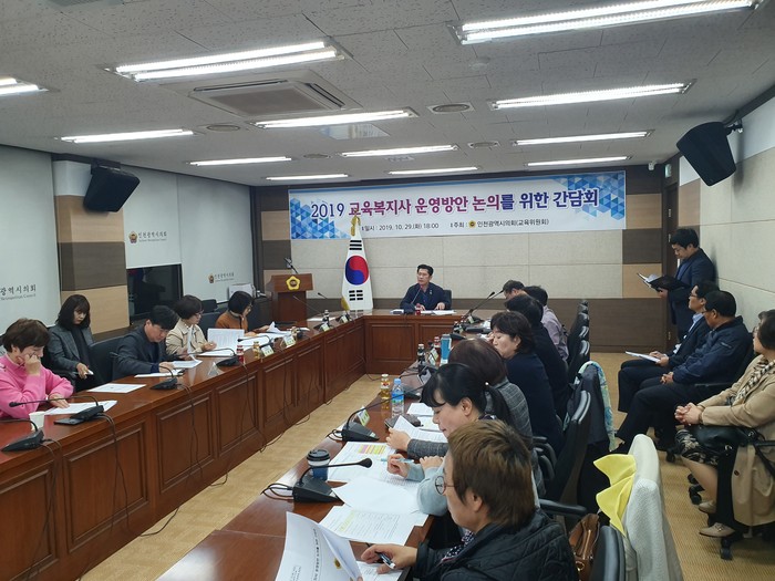 [인천=문찬식 기자] 인천시의회 교육위원회는 29일 시의회 의원총회의실에서 '교육복지사 운영방안 논의를 위한 간담회'를 개최했다.