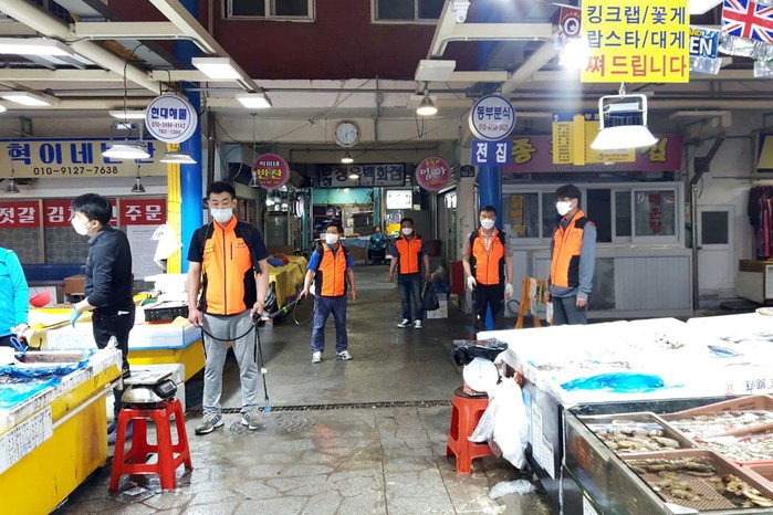 인천 동구 송림의용소방대가 4일 코로나19 확산 방지를 위한 방역활동을 전개했다. 이날 남성소대원 10여명은 유동인구가 많은 송림동 현대시장 일대를 중심으로 살균제와 압축분무기를 이용해 소독작업을 했다. 사진은 대원들이 소독작업을 하는 모습. (사진제공=인천 동구청)