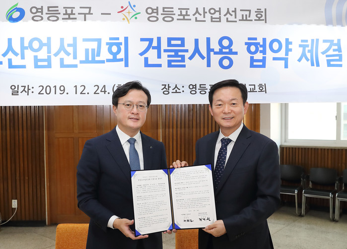 서울 영등포구가 최근 영등포산업선교회 3층 강당에서 영등포산업선교회와 함께 노동자종합지원센터 조성을 하기 위한 ‘건물사용 업무협약’을 체결했다. 사진은 채현일 구청장(왼쪽)과 산업선교회 관계자가 협약 체결 후 기념촬영을 하는 모습. (사진제공=영등포구청)