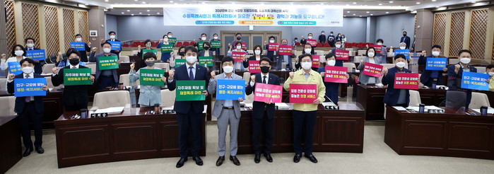 | ▲ 수원시의원들이 지방자치법 관계법령 개정을 촉구하는 퍼포먼스를 선보이고 있다. (사진제공=수원시의회) |