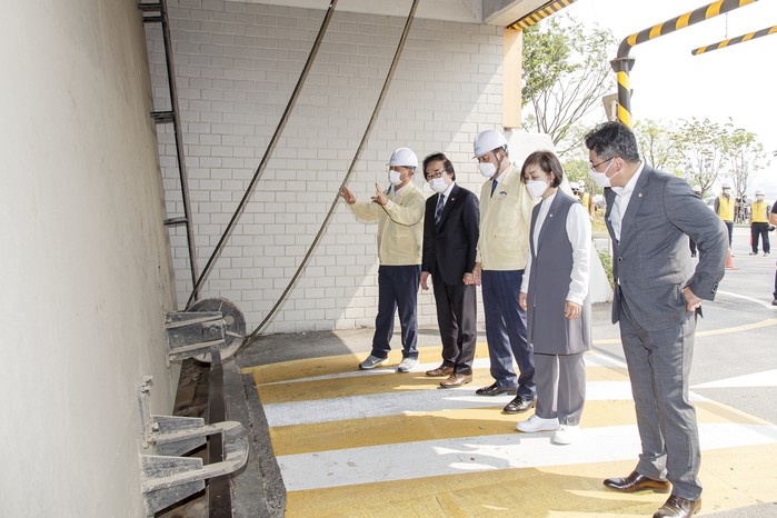 서울 유동균 마포구청장은 13일 올해 수방 대비를 위해서 망원육갑문 시운전 현장을 살펴봤다. 육갑문은 한강 제방을 횡단해 설치한 수문으로 홍수 발생시 한강물이 도심으로 유입되지 않도록 하는 시설이다. 사진은 유 구청장(가운데)이 시운전 현장을 점검하고 있는 모습. (사진제공=마포구청)