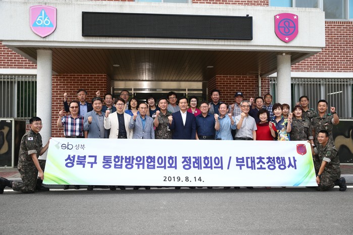 성북구통합방위협의회가 최근 육군 제2188부대를 방문해 여름철 폭염 속에 고생하는 군 장병들을 격려하고 국가안보관 확립과 통합방위태세확립에 기여하는 행사를 개최했다. 사진은 이승로 구청장과 관계자 및 장병들의 기념촬영 모습. (사진제공=성북구청)