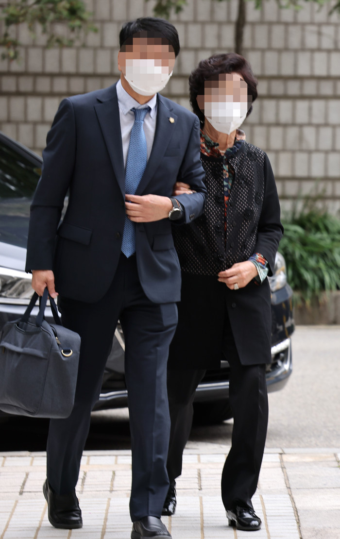 요양급여 부정수급 혐의로 1심에서 법정 구속된 후 보석으로 풀려났던 윤석열 전 검찰총장의 장모 최 모씨가 28일 오후 서울 서초구 서초동 서울고등법원에서 열린 2심 공판에 출석하고 있다.