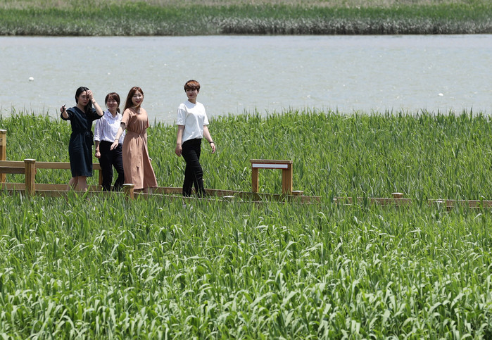 세차게 몰아치던 장맛비가 완전히 물러난 15일 전남 강진군 강진읍 ‘강진만생태공원’ 갈대밭이 청명한 날씨 속에 초록빛을 더해 시원한 여름 경치를 보여주고 있다. 사진은 주민들이 경치를 감상하고 있는 모습.(사진제공=강진군청)