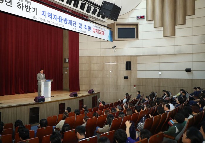 유동균 서울 마포구청장이 22일 구청 대강당에서 열린 '2019년 하반기 지역자율방재단 및 직원 방재교육'에 참석해 재난 및 안전사고 발생시 올바른 대처의 중요성을 강조했다. 사진은 유 구청장이 교육에 앞서 인사말을 하는 모습. (사진제공=마포구청)