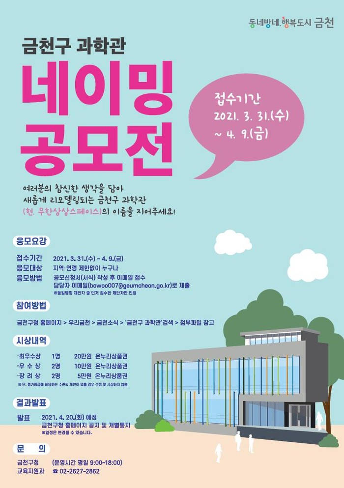 [시민일보 = 여영준 기자] 금천구(구청장 유성훈)는 오는 6월 초 준공 예정인 ‘금천형 과학관(가칭)’의 새로운 이름을 찾기 위해 오는 9일까지 명칭을 공모한다고 5일 밝혔다.