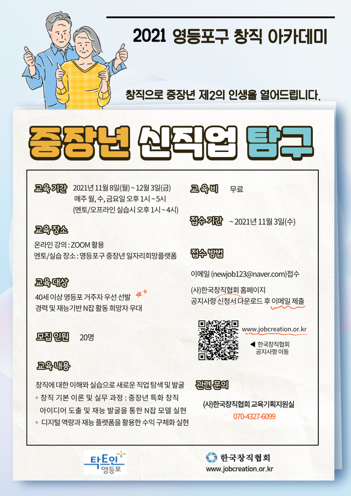 아카데미 수강을 희망하는 40대 이상의 중장년은 오는 3일까지 (사)한국창직협회 홈페이지에서 신청서를 다운받아 담당자 이메일로 제출하면 된다.