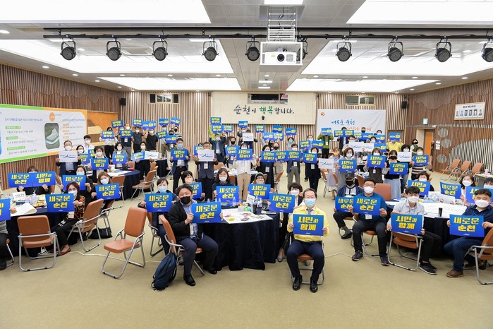 전남 순천시가 생활 속 지역 문제를 시민이 직접 발굴하고 해결방안을 찾는 ‘시민 해결 과제 토론회’를 시청 대회의실에서 개최했다고 밝혔다. 사진은 참석자들이 토론회를 마치고 ‘새로운 순천’, ‘시민과 함께’라는 문구가 적힌 종이를 들고 기념촬영을 하고 있는 모습. (사진제공=순천시청)