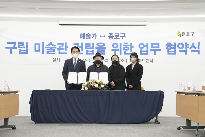종로구는 최근 ‘구립미술관 건립을 위한 업무협약식’에 참석했다. 구는 박서보·김구림 화백, 최종태 조각가와 업무협약을 맺고 구립미술관 건립을 위해 상호협력할 것을 약속했다. 사진은 협약식에서 김영종 구청장(왼쪽)이 김 화백과 기념촬영을 하는 모습. (사진제공=종로구청)