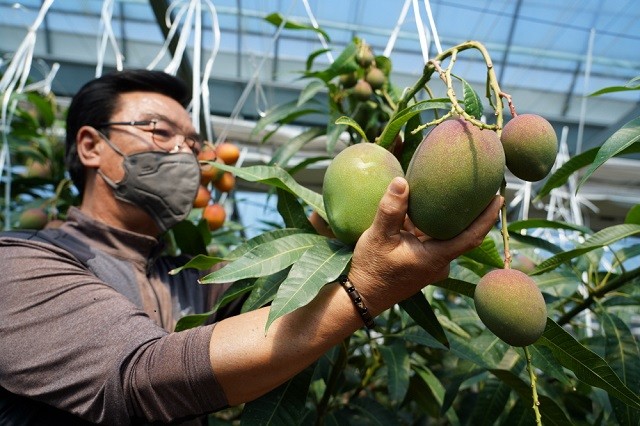 | ▲ 해남産 애플망고를 수확하고 있는 북평면 이상학 농업인 / 사진=해남군 제공 |