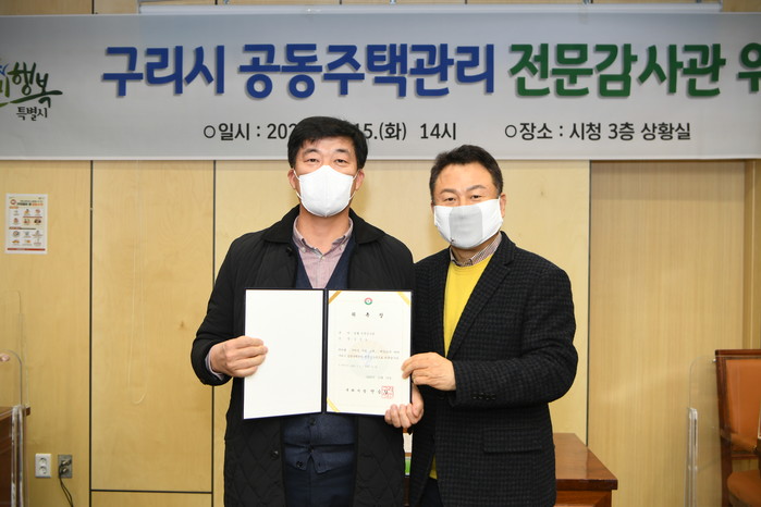 경기 구리시는 최근 '2020년 공동주택 관리 전문감사위원 위촉식'을 열었다. 이번 위촉식에는 공동주택관리 감사팀이 신설되고, 분야별 전문성을 확보한 민간전문가 15명을 공동주택관리 전문감사위원으로 위촉하고 임기는 2년이다. 사진은 안승남 시장(오른쪽)이 새로 임명한 위원에게 위촉장을 수여하고 기념촬영을 하는 모습. (사진제공=구리시청)
