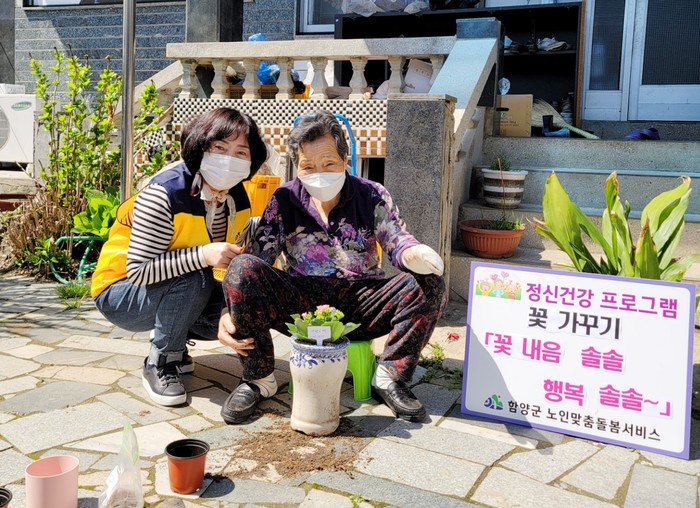 함양군 노인맞춤돌봄서비스는 어르신 댁을 정기적으로 방문하여 꽃가꾸기 등 다양한 체험프로그램을 지속적으로 제공함으로 인해 이용자들의 생활의 변화를 유도하고, 자발적 사회활동에 참여하게 하여 고립되기 쉬운 노후생활을 개선하여 삶의 만족도를 높일 수 있는 원동력이 되도록 노력하고 있다.