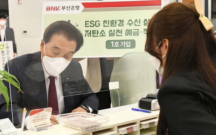 BNK김지완 회장과 부산은행 안감찬 은행장은 11일 본점 영업부에서 지역대표 금융기관으로서 저탄소 생활 실천 문화 확산을 선도하겠다는 의지를 담아 적금을 가입했다.