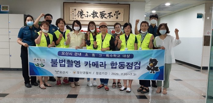 경기 오산시는 오산경찰서와 이달 말까지 지역내 초·중·고·특수학교 총 43곳을 대상으로 ‘불법촬영카메라 합동점검’을 실시한다. 점검반은 전문장비를 활용해 불법촬영 카메라 설치 여부를 확인하고, 적발 시에는 즉시 수사 의뢰할 방침이다. 사진은 점검반이 기념촬영을 하는 모습. (사진제공=오산시청)