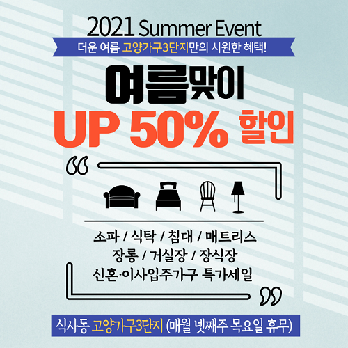 이번 행사는 고양가구단지3단지에 입점해 있는 모든 매장에서 단독 진행하는 여름맞이 할인행사로 전시되어 어느 곳을 방문하셔도 제품을 직접 체험해보고 할인을 받아 구입할 수 있다.