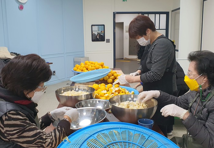 서대문구 연희동 자원봉사캠프가 최근 ‘희망의 유자청 나눔’ 사업을 진행했다. 이날 캠프 회원들은 유자청을 만들어 연희동 주민센터를 통해 홀몸노인 20여가구에 전달했다. 사진은 회원들이 유자청을 만들고 있는 모습. (사진제공=서대문구청)