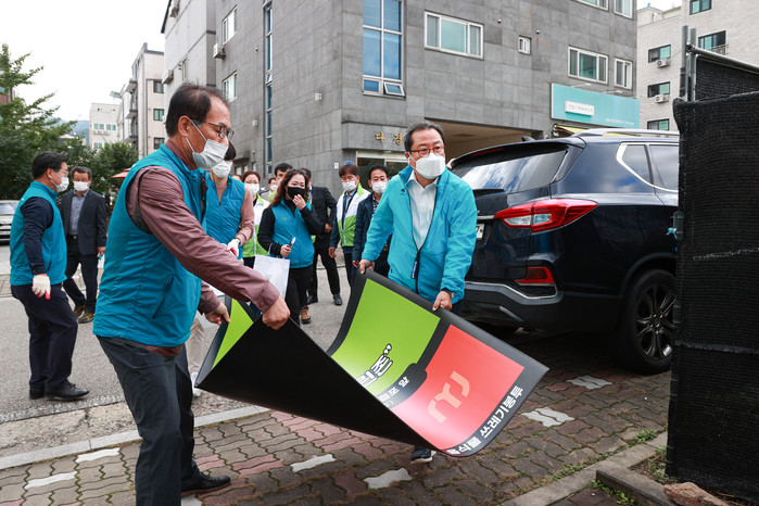 조광한 경기 남양주시장은 12일 진접읍의 생활쓰레기 배출 개선 프로젝트로 금곡리 1037-18 일원에 조성된 ‘마이홈 클린존’과 와촌마을 입구 교차로에 설치된 ‘3색존’ 현장을 확인하고 지역 주민들과 소통했다. 사진은 마이홈 클린존 현장에서 조광한 시장(오른쪽)이 고무 매트를 옮기고 있는 모습. (사진제공=남양주시청)