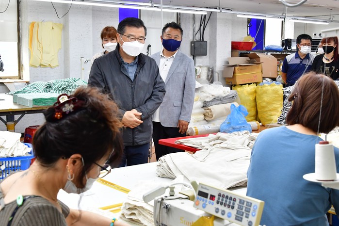 | ▲ 지난 14일 지역 봉제업체를 방문해 의견을 나누는 류경기 중랑구청장 (사진제공=중랑구청) |