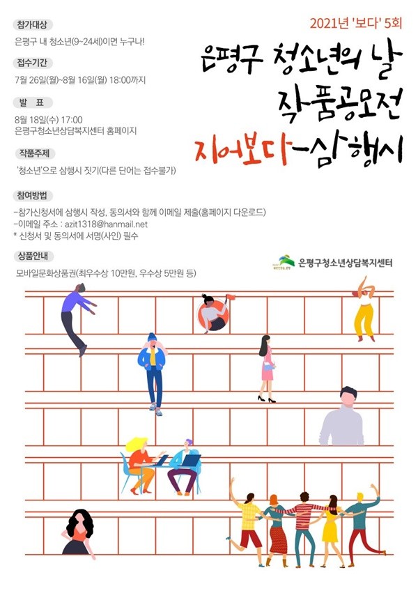 첫 번째 프로그램 ‘은평구 청소년의 날-삼행시를 지어보다’는 청소년으로 삼행시 짓기 공모전이다. 참여는 오는 16일 오후 6시까지 참가신청서와 동의서를 담당자 이메일(azit1318@hanmail.net)로 보내면 된다. 서식은 은평구청소년상담복지센터 홈페이지에서 내려받을 수 있다. 공모 결과는 18일 오후 5시 센터 홈페이지를 통해 공지될 예정이다.