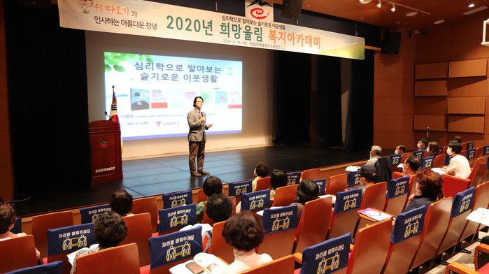 이날 강연은 명예사회복지공무원 동동그리미와 지역사회보장협의체위원, 사회복지시설 종사자 등 60여명이 참석한 가운데 고려대학교 대학원 아동코칭학과 강의전담교수인 이재연 교육학 박사의 ‘심리학으로 알아보는 슬기로운 이웃생활’이라는 주제로 열렸다.