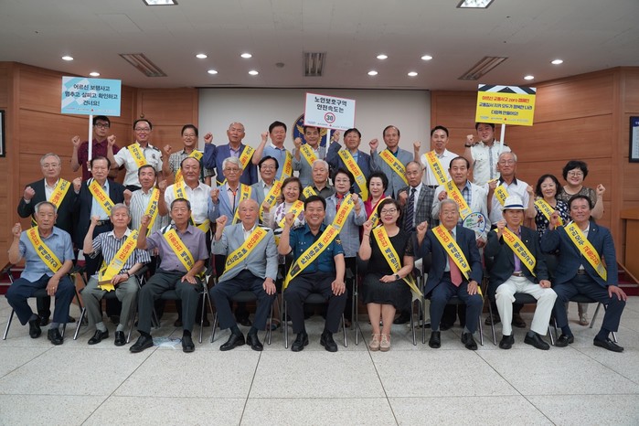 경기 여주경찰서는 최근 대한노인회 여주시지회 및 여주시 노인복지관과 노인들의 교통사망사고 예방을 위한 유관기관 간 업무협약을 체결했다. 사진은 협약식에 참석한 관계자들이 '파이팅'을 외치는 모습. (사진제공=여주경찰서)