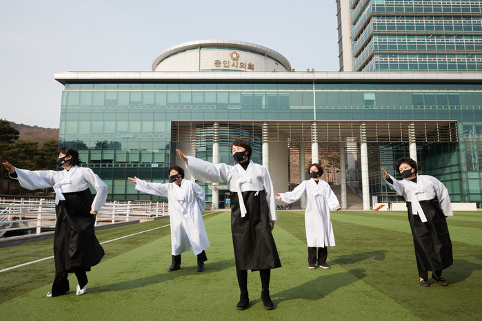| ▲ 용인시의회 잔디 광장에서 독립만세운동 기념 플래시몹을 펼치고 있다. (앞줄 왼쪽부터 이은경·유진선·남홍숙 의원, 뒷줄 왼쪽부터 장정순·명지선 의원) |