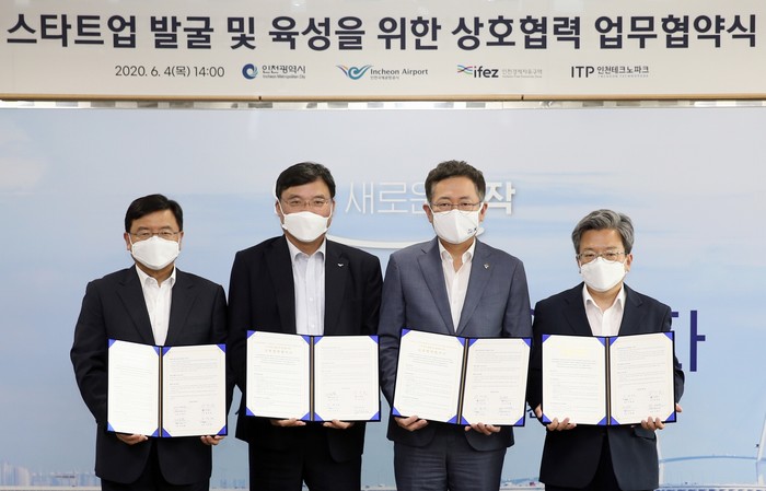 인천경제자유구역청이 4일 인천시청 2층 대접견실에서 인천시, 인천경제청, 인천국제공항공사, 인천테크노파크 등 4개 기관과 스타트업의 발굴 및 육성을 위한 상호 업무협약을 체결했다. 사진은 서명한 협약서를 들고 기념촬영을 하고 있는 기관장들의 모습. (사진제공=인천경제자유구역청)