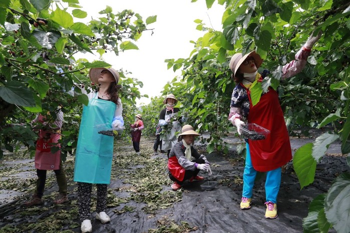 5일 전남도민명예기자단 50명은 코로나19 여파와 고령화로 인한 농촌 일손 부족 등의 어려움을 겪고 있는 농가에 도움을 주기 위해 보성군 벌교읍 고읍리 오디 농원에서 전남도청 대변인실 직원들과 농촌 일손 돕기 봉사활동을 추진했다. 사진은 오디 수확에 구슬땀을 흘리고 있는 봉사자들의 모습. (사진제공=보성군청)