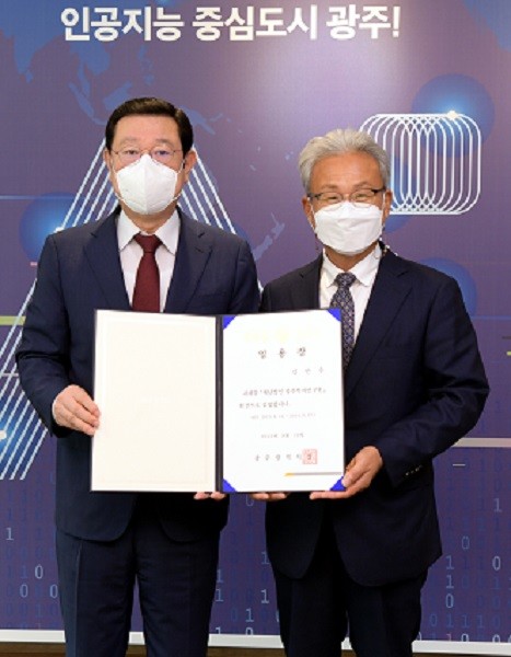 | ▲ 이용섭 광주광역시장이 13일 오전 시청 접견실에서 김만수 광주복지연구원장에게 임용장을 수여한 후 기념촬영을 하고 있다. /광주광역시 제공 |
