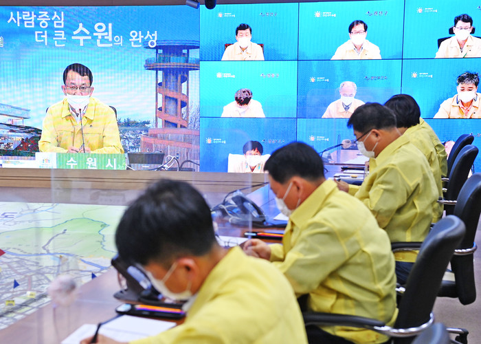 경기 수원시가 최근 '수도권 거리두기 4단계' 격상에 따른 코로나19 긴급 방역점검회의를 개최했다. 사진은 이날 회의를 주재한 조청식 제1부시장(화면 왼쪽)이 발언을 하고 있는 모습. (사진제공=수원시청)