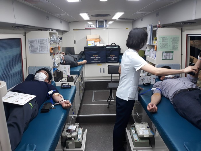 경기 이천시 설성면 이장단협의회는 최근 장기화된 코로나19로 인한 혈액수급에 비상이 걸린 가운데 헌혈봉사를 진행했다. 사진은 이날 헌혈봉사에 참여한 이장단협의회와 주민들이 헌혈을 하고 있는 모습. (사진제공=이천시청)