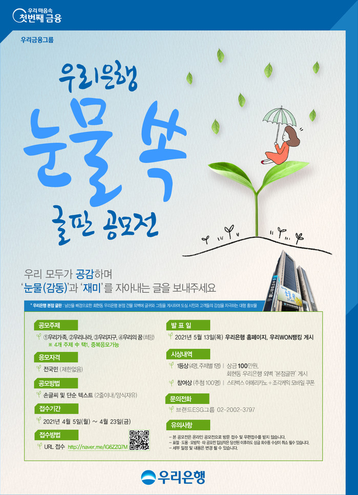 이번 공모전은 서울 명동 중심지에 위치한 우리은행 본점 글판에 고객들이 직접 응모, 선정된 문구를 게시해 고객들의 참여와 관심을 높이기 위해 마련됐다.