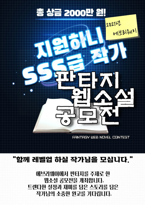 [시민일보 = 이승준] 네이버 시리즈 매열무를 진행한 <리치, 방사능을 먹어치우다!>, <망겜 개발자의 던전 관리 지침서> 등 신선한 웹소설을 발굴해낸 웹소설/전자책 전문회사 ‘에브리웨이’는 최근 진행한 총 상금 2,000만원의 판타지 공모전의 수상작을 발표했다.