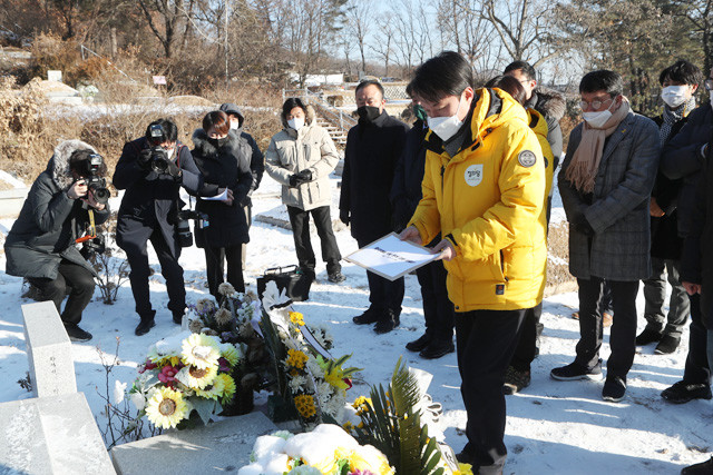 노회찬 묘소 찾은 정의당 “중대재해법 후퇴 죄송”