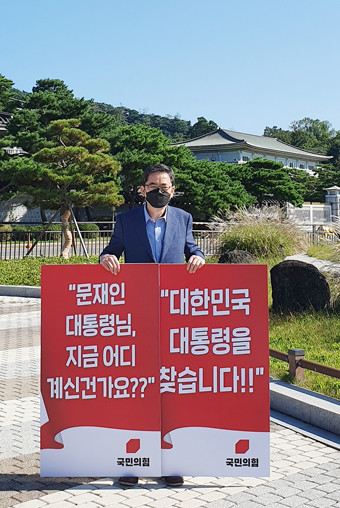 국민의힘 곽상도 의원이 27일 오전 청와대 분수대 앞에서 북한의 해수부 공무원 피격 사망사건과 진상조사를 요구하는 1인 시위를 하고 있다.