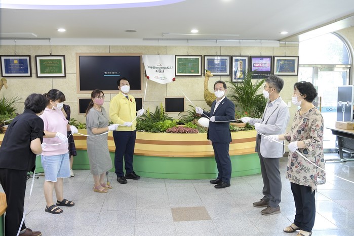 전남 순천시가 최근 교육부 주관 ‘2021년 장애인 평생학습도시’ 선정을 축하하며 현판식과 공감토크를 개최했다. 시는 이번 선정으로 장애인과 비장애인이 함께 평생학습 공동체 환경조성 등을 목표로 40여개 사업을 추진하고 있다. 사진은 허석 시장(가운데 오른쪽)이 관계자들과 현판식을 진행하고 있는 모습. (사진제공=순천시청)
