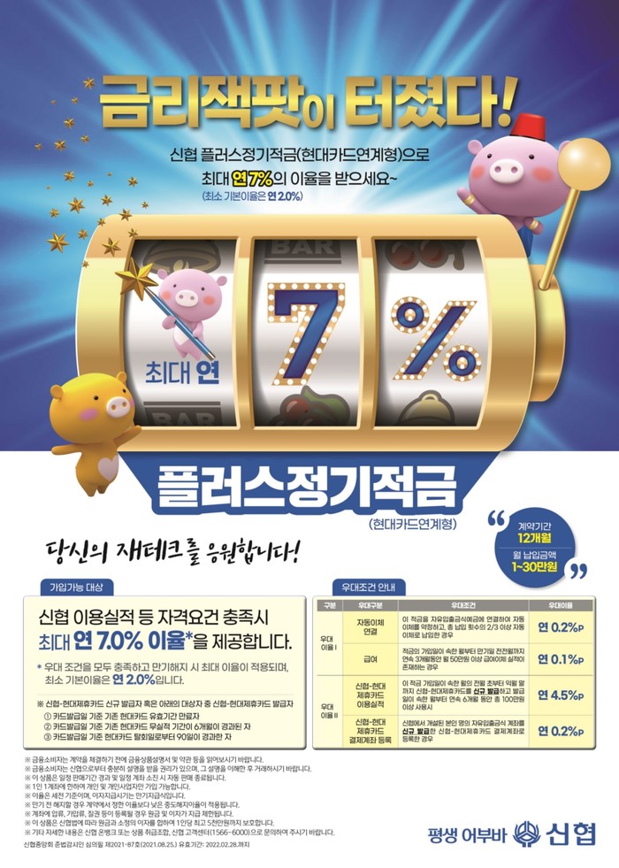 [시민일보 = 여영준 기자]신협중앙회(이하 신협)는 연 최고 7%의 높은 이율을 제공하는 ‘플러스정기적금(현대카드연계형)’을 새롭게 출시했다고 7일 밝혔다.