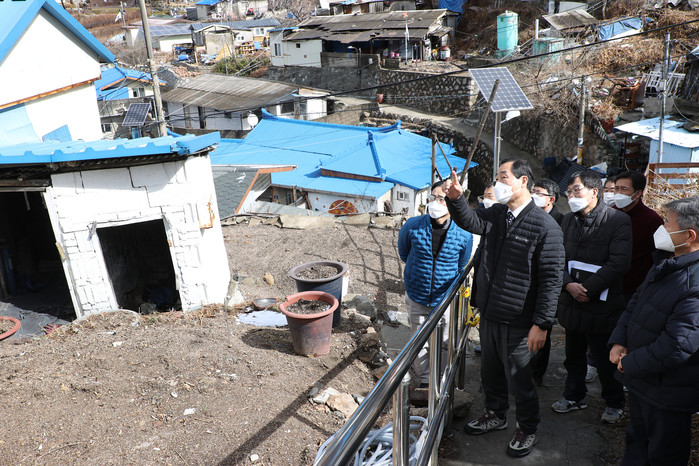 문석진 서대문구청장이 지난 2일 홍제3동 개미마을을 찾아 해빙기 안전실태를 점검하고 ‘지역내 해빙기 위험요소를 조기 발견하고 재난예방과 주민안전에 만전을 기할 것’을 관계 직원들에게 지시했다. 사진은 문 구청장(가운데)이 현장점검을 하는 모습. (사진제공=서대문구청)