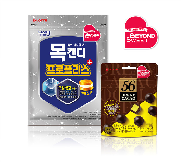 롯데제과가 ‘비욘드스위트’ 프로젝트로 처음 선보인 제품은 ‘목캔디 프로폴리스 허브진저’, ‘드림카카오 56 비타민E’ 등 2종이다.