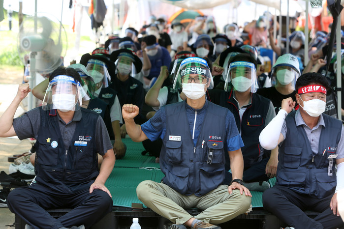 전국민주노동조합총연맹(민주노총)이 지난 7월30일 오후 강원 원주시 건강보험공단 앞 농성장에서 '비정규직 노동자 직접 고용 촉구 집회'를 하고 있다.