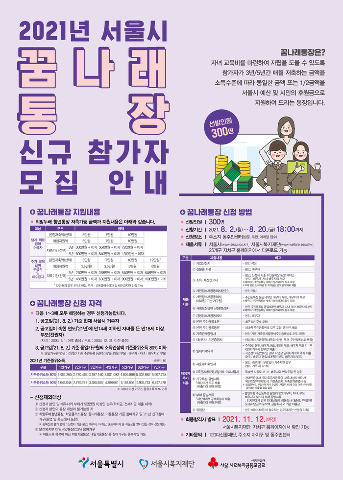 신청 자격은 공고일(2021년 8월2일) 기준 현재 서울시에 거주하는 만 14세 이하의 자녀를 둔 만 18세 이상 부모로 동일가구원의 소득인정액이 기준중위소득 80% 이하(3자녀 이상 가구는 기준중위소득 90% 이하)이면 신청할 수 있다.