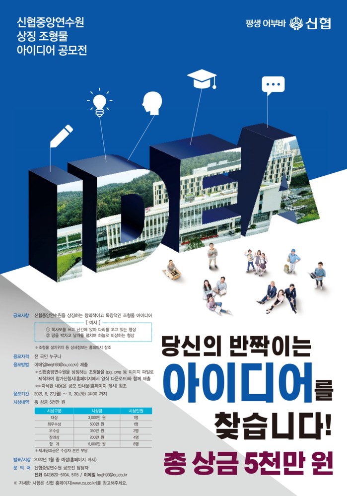 이번 공모전은 신협중앙연수원에 설치될 조형물 아이디어를 응모자가 직접 제안함으로써 ‘내가 만드는 신협 이미지’의 기회 제공과 더불어 신협에 대한 관심과 인식 제고를 위해 기획됐다.