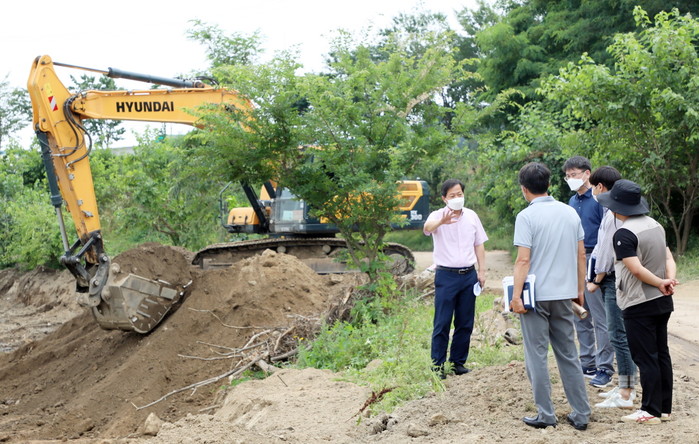 경기 수원시 권선구는 1일 장마철에 대비하기 위해 구청장 및 관계자들이 서호천·수원천의 하천유지관리 현장 등 재해 취약지역의 주요사업 현장 4곳을 방문해 점검했다. 사진은 서경보 구청장(왼쪽)이 관계자들과 재해 취약지역 현장점검을 하고 있는 모습. (사진제공=권선구청)