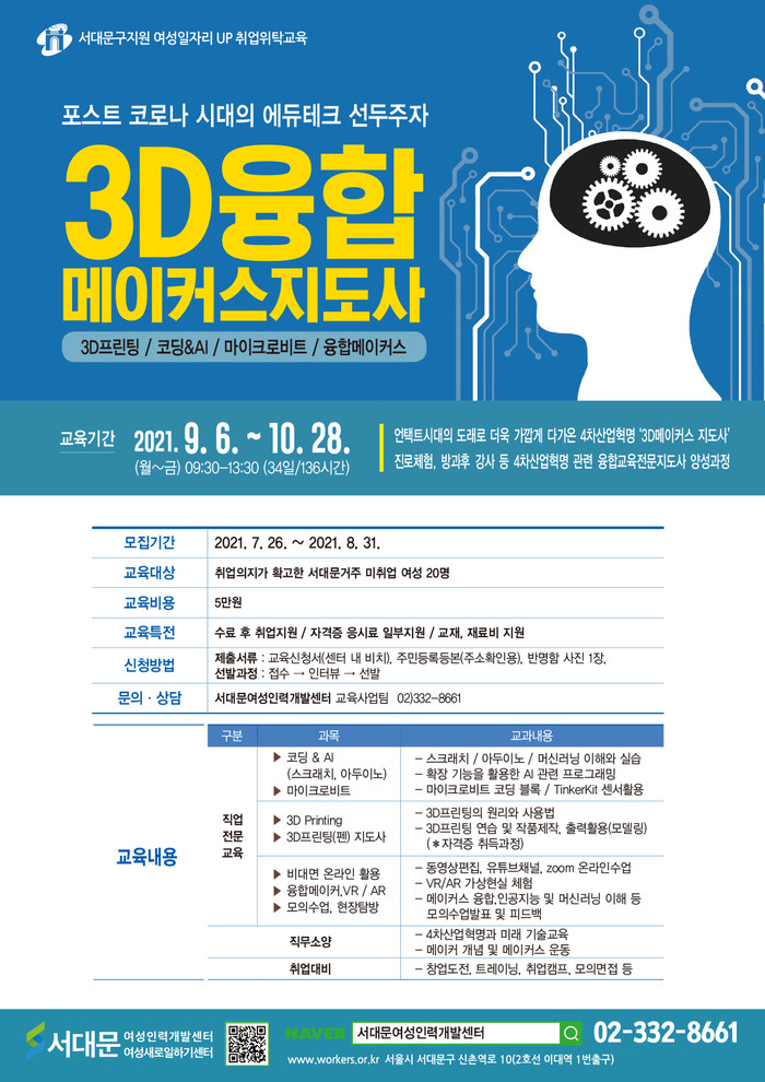 자세한 내용은 서대문여성인력개발센터 홈페이지를 참고하거나 센터 교육사업팀으로 문의하면 된다.